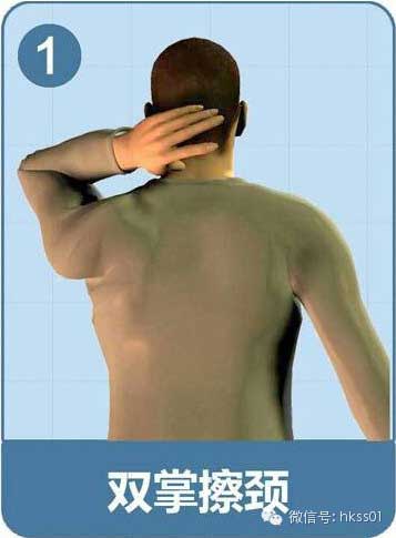 用左手掌來(lái)回摩擦頸部,口中默念8下后,開始 捏后頸。然后換右手。有助于頸部放松。