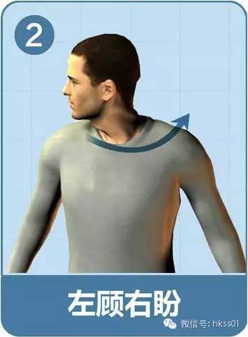 頭向左轉(zhuǎn)90度,停留3秒,再向右轉(zhuǎn),停留3秒。做兩個(gè)8拍。
