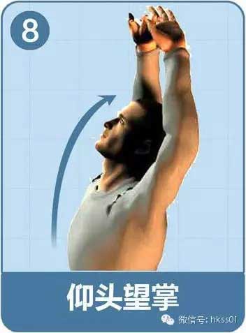 雙手上舉過(guò)頭,手指交叉,掌心向上。將頭仰起看向手背。保持5秒。
